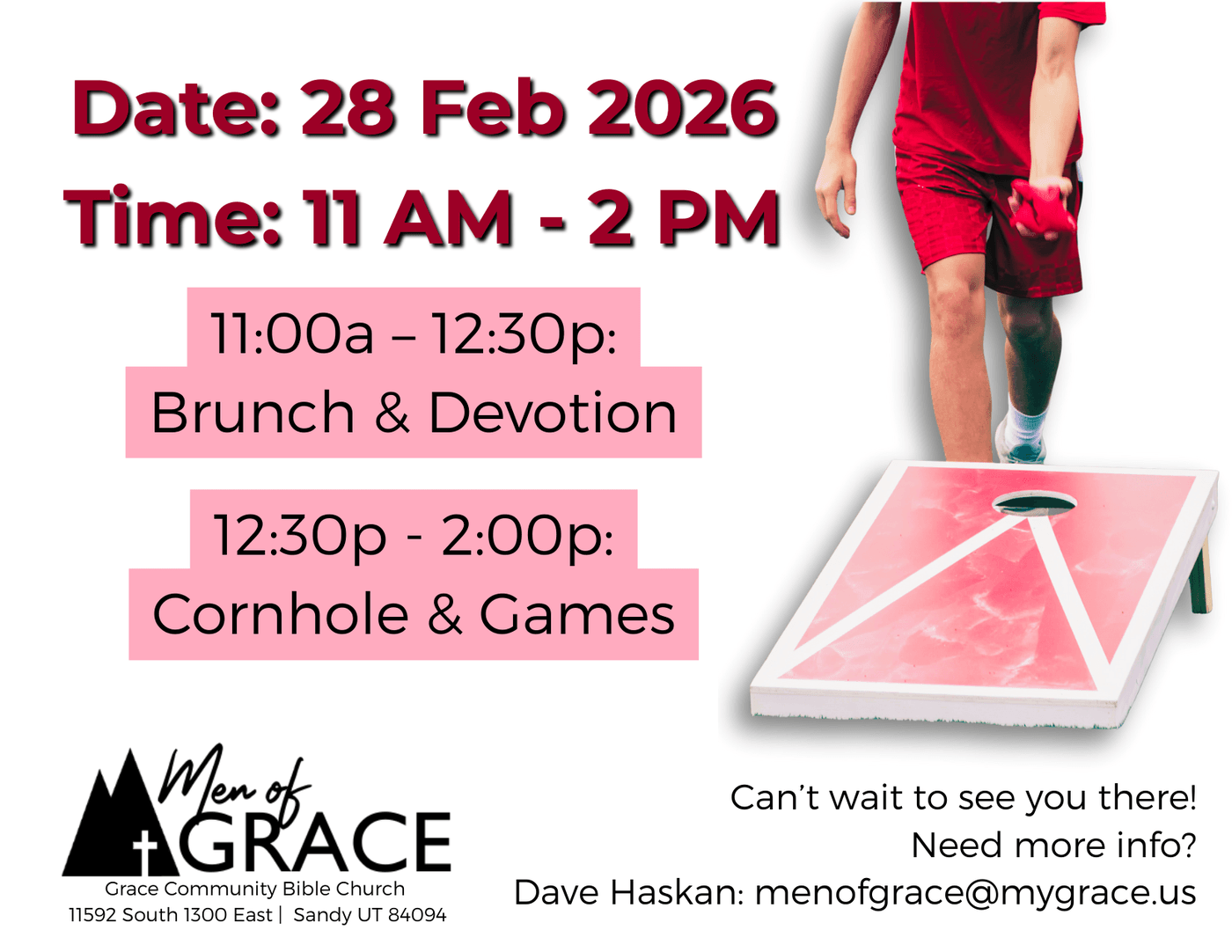 All men of Grace (18 and older), are invited to gather together, enjoy a Devotional Brunch, followed by cornhole, games and fellowship together! Invite your friends!